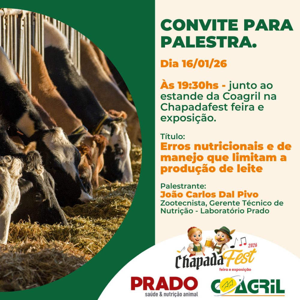 Às 19:30 hs: Palestra técnica com o Departamento Pecuário da COAGRIL e PRADO Saúde & Nutrição Animal.