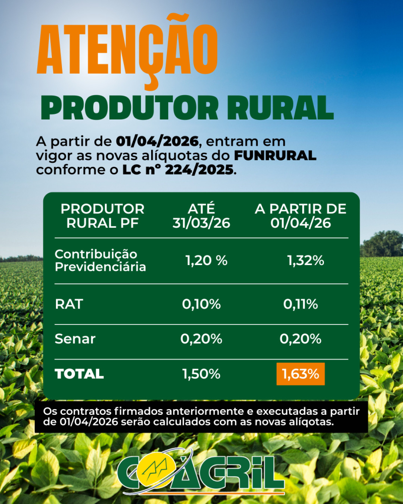 Produtor rural, fique atento !A partir de 01/04/2026 passam a valer as novas alíquotas do FUNRURAL, conforme a LC nº 224/2025.